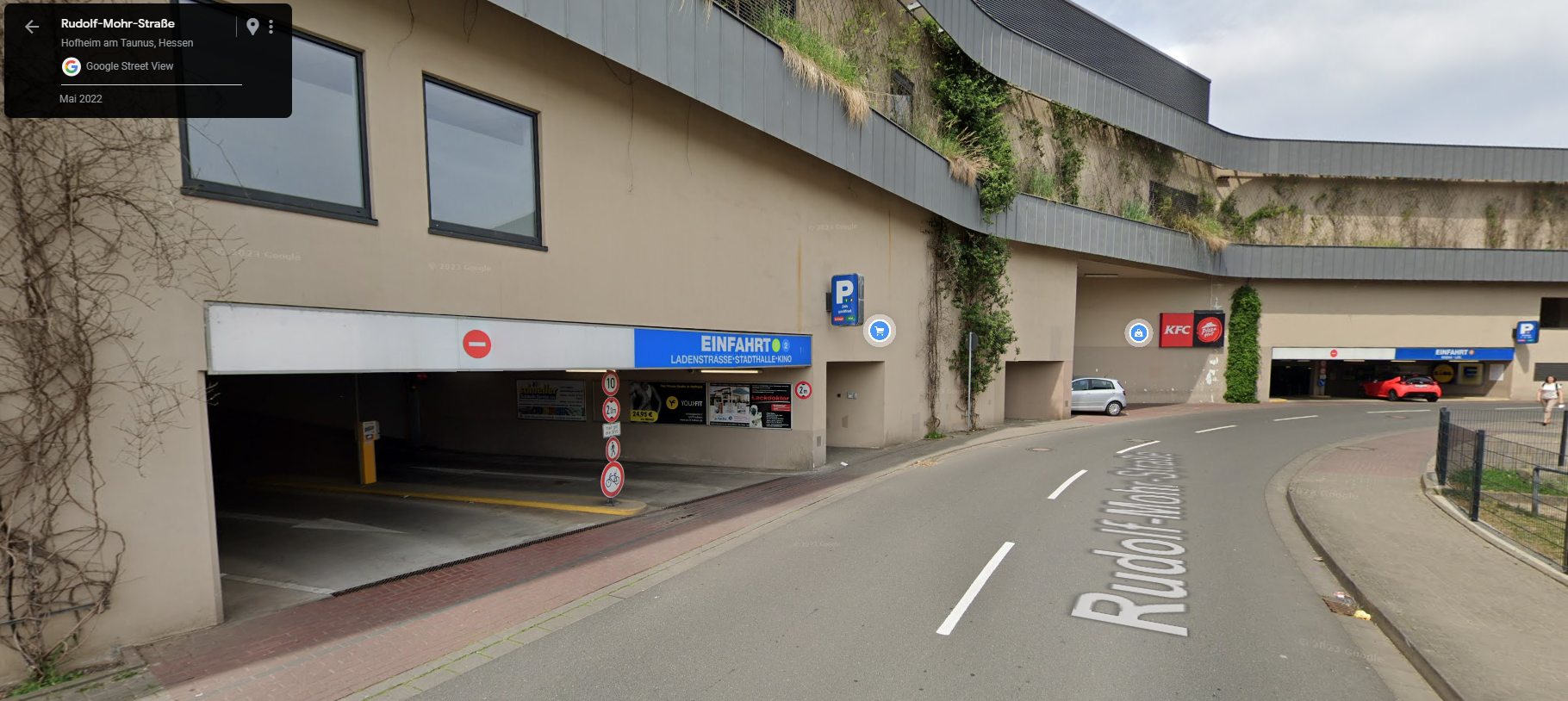 Die Tiefgarage (rechts im Bild) wird nachts geschlossen, die Ausfahrt ist nach Ladenschluss nicht möglich.